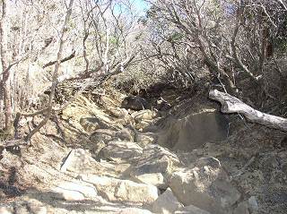 この辺りの登山道は表土を流されていて、潅木が覆い被さった所では 背中を丸めながら登ら