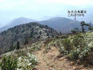 遠くから見て 手前のピークが山頂だと思っていましたが、山頂は 足元が心もとない藪漕ぎを
