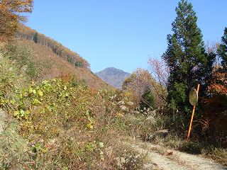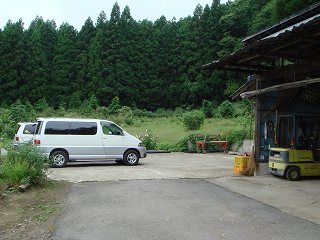 坂道を登って行くと 広い畑の右奥に小山氏の家が見えて、その先の杉林の中にある案内