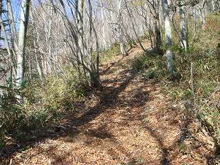 この辺りの林床にはアスナロの若木が密生していて、一瞬ですが 右の樹間に日留賀岳の