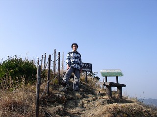 登山口から30分登って展望台に着くと、その上にあるベンチから 伊予ヶ岳の山頂に立つ