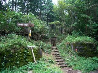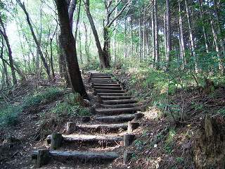 登山口からヒノキ林の中を登って行くと急な階段があって、その先で 直登コースと階段
