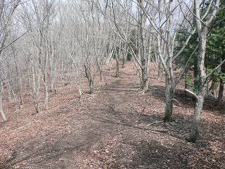 2つのピークを巻いて なだらかに登って行く登山道では、左の雑木林の奥に 浅間山から