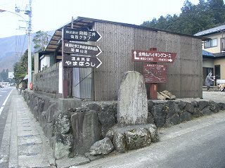 (矢倉沢峠に立つ道標、左に登れば金時山)________(うぐいす茶屋)