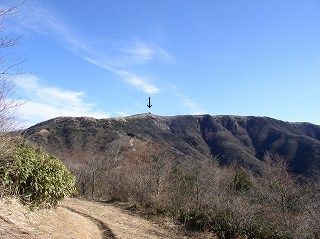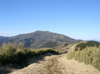 道を15分歩いて 再び南斜面に出ると、前方に 電波反射板が建つ明神ヶ岳が見えます。