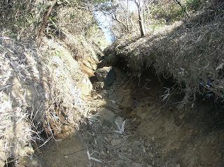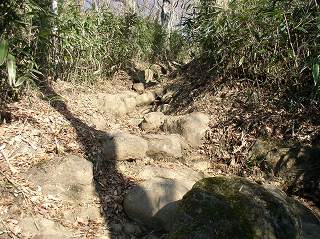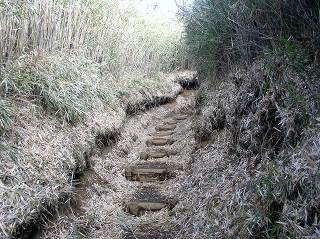バス停から10分登った所にある登山口から 篠の中の溝に作られた階段を登ります。