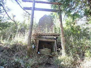 __(明星ヶ岳の山頂に立つ標識)__________(山頂にある鳥居と祠)