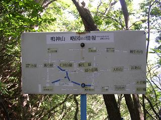 鳥居から急登を5分登ると稜線に出て、そこにある鳴神山の略図から右上に登った所が