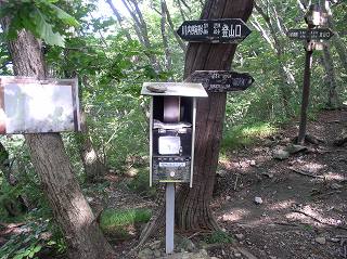 ___(登山者カードポスト)_________(鳥居の奥に 雨戸を閉め切った建物)