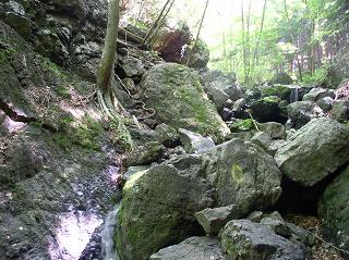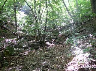 ここから岩が散乱する道を登って行くと やがて踏み跡が消えて、小さな渡渉をした所から