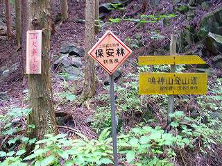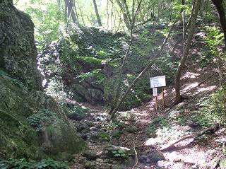 杉林を抜けると 再び登山道が荒れて、大きな岩の前にある看板の所で沢の水が涸れると