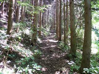 やがて杉林に入ると 歩きやすい緩斜の道になって、ここでは 地元の小学生が設置して