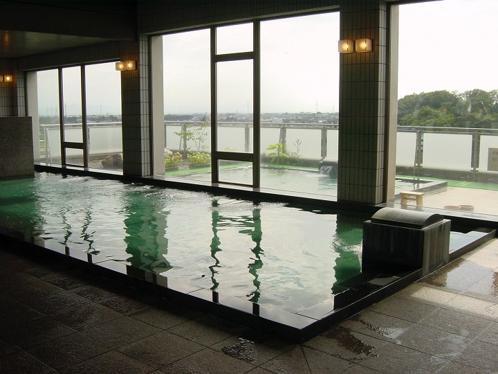 ___(大きなガラス窓の内湯)________(開放感がある最上階の露天風呂)