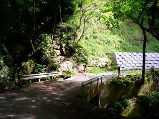 直進する狭い道を入ると すぐに行き止まりになって、不死熊橋の前に3台の駐車スペースが