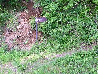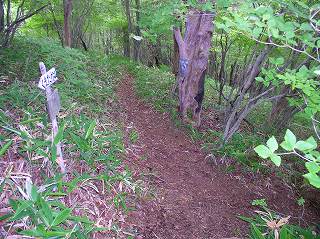 オフロードの林道を10分歩いた所から中尾根コースの道標に従って左上に行き、そこから