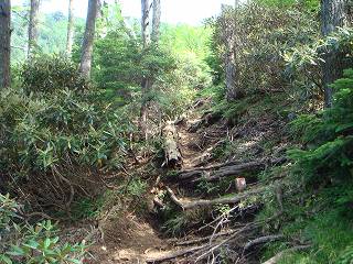 ベンチから30分登ってシャクナゲが目立つようになると登山道が荒れてきて・・