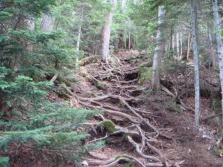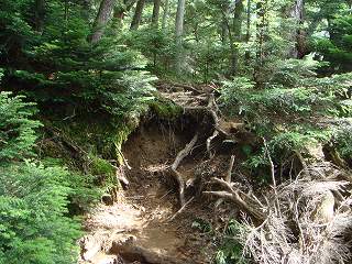 ___(土が流された登山道)____________(木の根が出た登山道)
