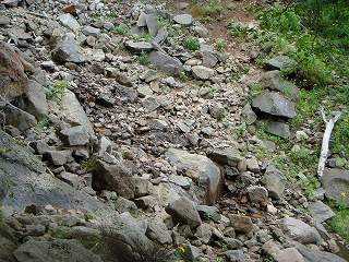 避難小屋から10分登った所で 傾斜のきついガレ場を登ります。