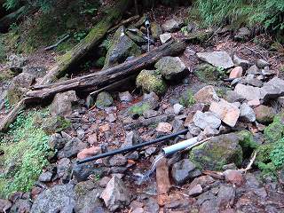 ベンチから40分登った所で わずかな水が流れる沢を横切ると 対岸に水場がありますが、