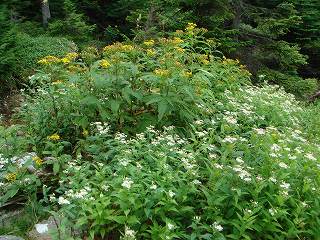 避難小屋の庭には ハンゴンソウ・ヤマシロギク・マルバダケブキが咲いて・・