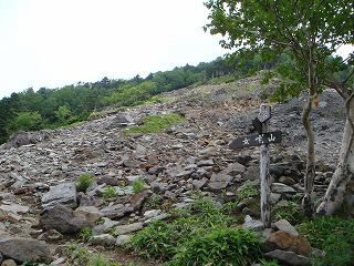 __(ガレ場の入り口に立つ道標)___________(ガレ場の登山道)