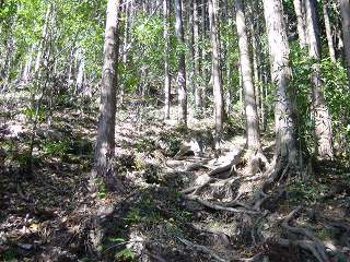 自然休養林の看板から左上に登ったら、間もなく 杉林の中の傾斜のきつい登山道を登ります。