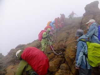 ここから朝日岳までクサリが連続する岩場を登りますが、2012年は強風で大変でした。