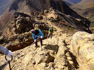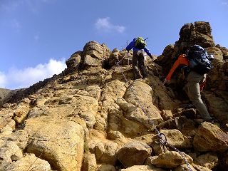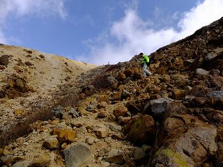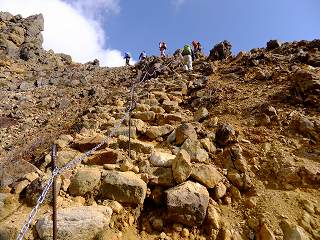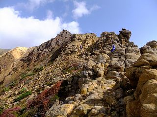 長いクサリ場の上で傾斜のきついガレ場を登ったら、今度は 急斜面の岩場を登ります。