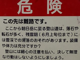 峰の茶屋避難小屋から朝日岳に向かう登山道の入り口に 下の注意看板がありました。