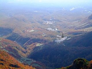 ______(山腹の紅葉)___________(矢印の所が峠の茶屋駐車場)