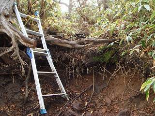 __(木の根と石が出た登山道)________(段差の大きい所に設置されたハシゴ)