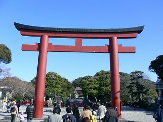 ___(鶴岡八幡宮の大鳥居)__________(隠れ銀杏と鶴岡八幡宮本殿)