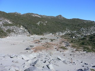 展望地から下りた所には 砂浜と見まごうような細かい白砂の平地が広がっていて、その