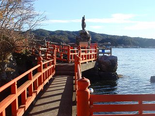 神明崎にある管弦窟と呼ばれる鍾乳洞は 朱塗りの欄干から見られます。