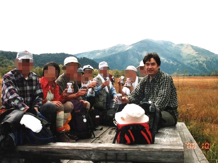 (木道の休憩スペースで乾杯)