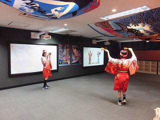 2階にあるブースでは モニターでよさこい踊りの手ほどきをしていて、