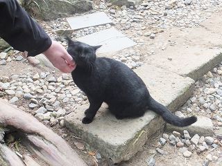 神社の境内に とても人懐っこい黒ネコがいました。