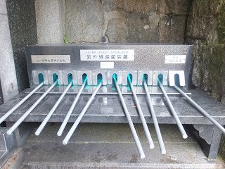 音羽の滝の柄杓は 皆が口を付けて水を飲むので、使用後は紫外線で消毒されるように