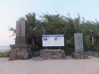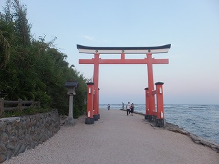 砂浜の白い砂は小さな貝のかけらでできていて、その先にある大鳥居をくぐると 左に参道が