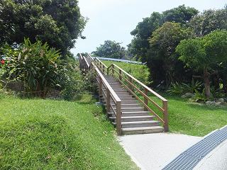 階段の上でアスファルトの道を登って行くと 再び勝連城の案内があって、そこから左上に