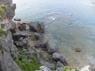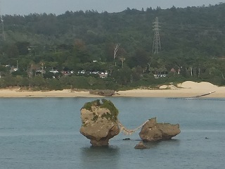 岬の北東にANAインターコンチネンタル万座ビーチリゾートが見えて、湾の中には 注連縄で