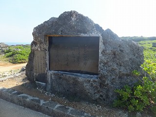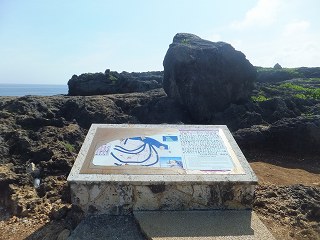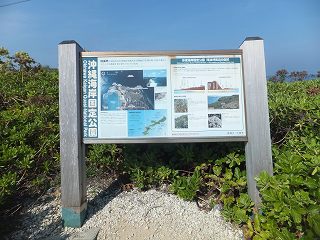 灯台の近くに 沖縄海岸国定公園の案内板と琉歌 特牛節の碑があります。