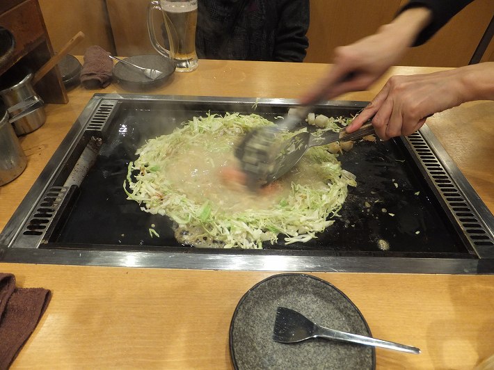 こちらの店では 店員が もんじゃ焼きを焼いてくれます。