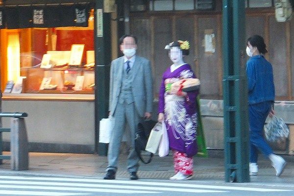 四条通りに出ると、客と同伴をしているかのような舞妓さんがいました。