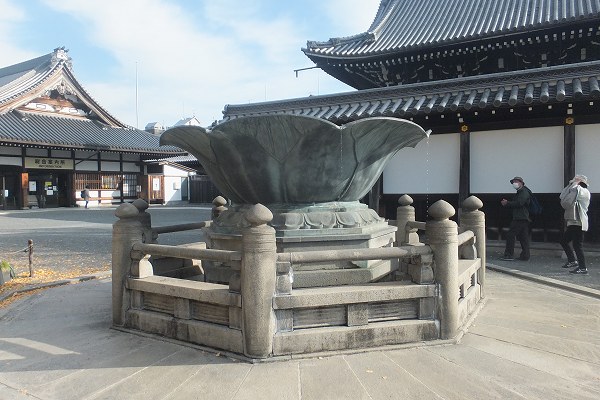 大きな花から水がしたたり落ちる 銅製の手水のような物の向かいに・・