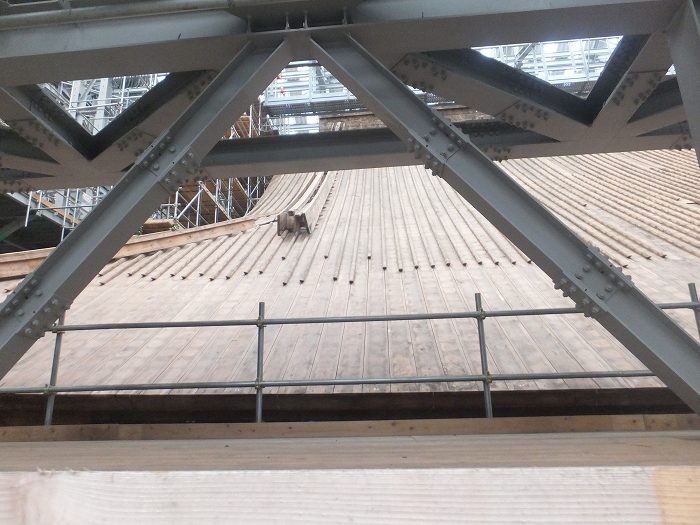 ________(建屋を支えるH鋼の隙間から見た本堂の屋根)