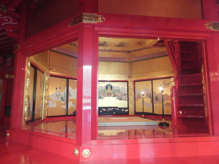 天守の5階は天界をイメージした朱塗りの八角形の部屋で、金箔の