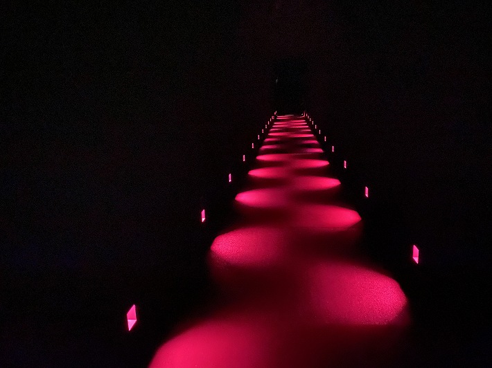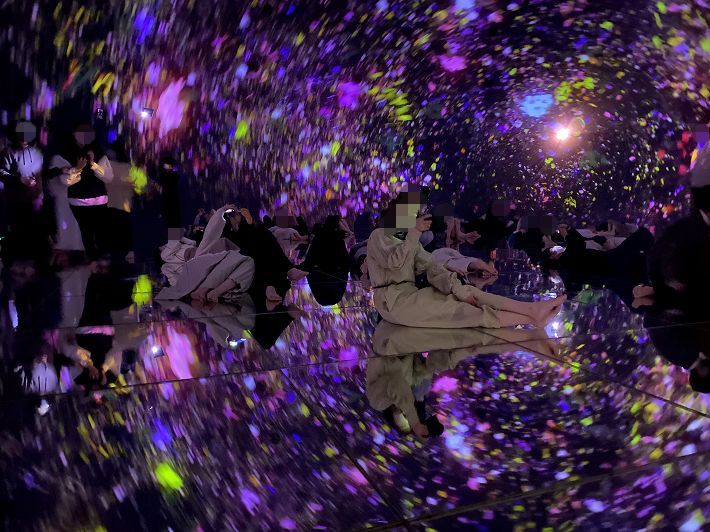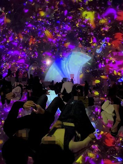 ![]() ____________(新豊洲駅) ![]() __________(チームラボの入り口) 入場は30分毎の時間制で、館内に入ったらロッカーに上着と靴と 靴下を入れて ズボンを膝までめくり上げます。 ![]() ____________(ロッカー) 支度を済ませたら 水が流れる坂を登って行きます。 ![]() ___________(水が流れる坂) 最初のアトラクションは「The infinite Crystal Universe」で、 床・天井・壁が鏡張りになった空間に無数に吊り下げられたLED ライトが入ったチューブが点滅パターンを次々に変えて、まるで 異次元の空間にいるかのような感覚を味わえます。 ![]() __________(無数のLEDライト) ![]() ___________(鏡張りの床を撮影) ![]() _________(天井に観客が写ってます) 次のアトラクションに行く通路では 暗闇の中に照らされた赤く 丸い光がワクワク感を醸し出してます。 ![]() ___________(暗闇に浮かぶ赤い光) 長い通路を歩いた先にあるのは「人と共に踊る鯉によって描かれる 水面のドローイング」で 水面に投影されたプロジェクション マッピングの鯉が人間を避けたり寄って来たりして・・ ![]() _________(水面に投影された錦鯉) 壁の中にある部屋の中では倒景の憑依する炎が水面に怪しく燃え 続けています。 (倒景の憑依する炎)次のアトラクションは「意志を持ち変容する空間、広がる立体的 存在」で、部屋の中に浮遊する球体が色を変えて体を包み込みます。 ![]() ___________(緑色に光る球体) ![]() __________(次々に色を変えます) 次の部屋では 半球体の部屋の天井にプロジェクションマッピングの 花や蝶が飛び交って、思わず床が回転しているような錯覚に陥ります。 ![]() _(床に寝転がって鑑賞してます) ![]() _________(激しく回転する映像) 4つの作品空間を体験したら、元のロッカー室に戻って上着を着て 庭園に出ます。 庭園には2つあって、最初に「呼応する小宇宙の苔庭」では 固形化 された光の色の不思議な物体を見られます。 ![]() _________(呼応する小宇宙の苔庭) |