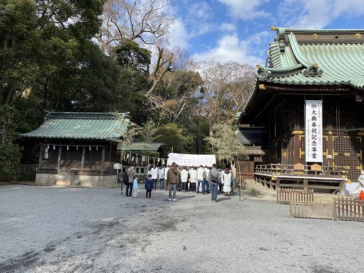 本殿の左にある若宮神社の所で儀式をする参拝者がいて、右には 熊手や破魔矢などの