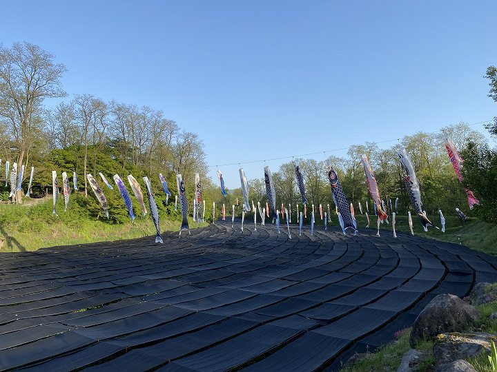 (わさび田の上を泳ぐ鯉のぼり)